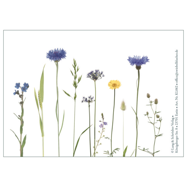 Hochwertige Klappkarte mit fröhlichem Kornblumenmotiv auf Vorder- und Rückseite der Karte. Mit kleinem Schmuckbild auf der Innenseite.