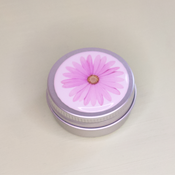 Kleines Pillendöschen mit Schraubdeckelverschluss und Doming-Aufkleber aus Epoxidharz.