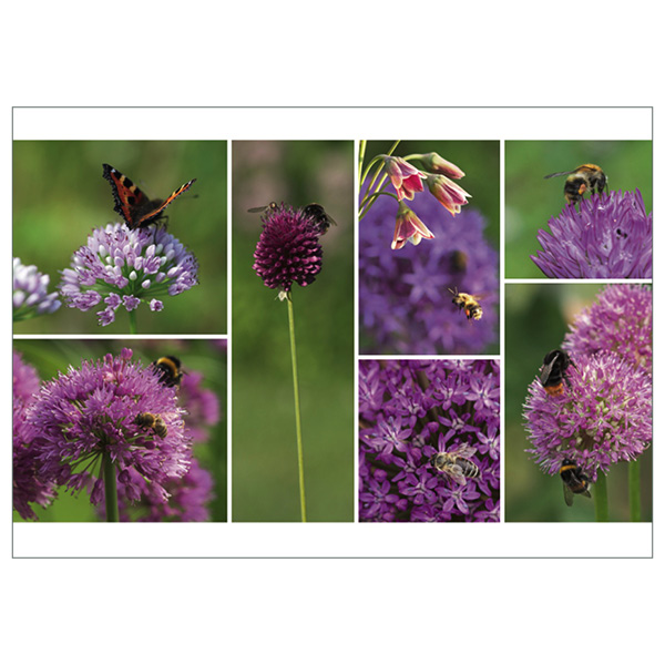 Diese Karte zeigt Bienen, Hummeln und Schmetterlinge auf unterschiedlichen Allium-Blüten.
